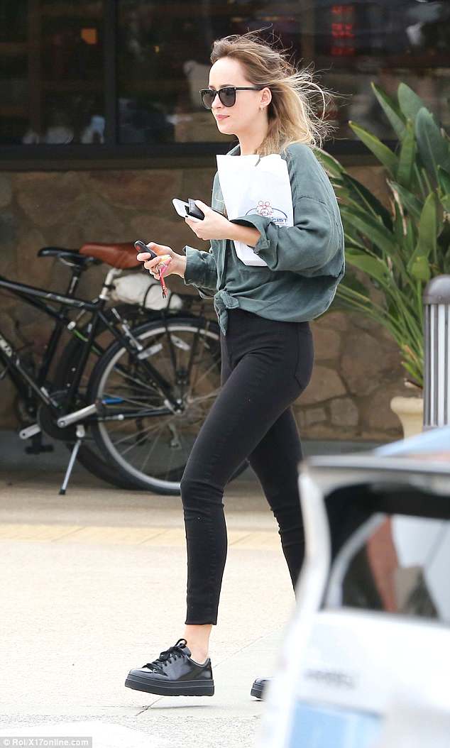 Dakota appeared very fresh-faced for her chilled outing, with only a light touch of natural make-up while dainty gold earrings polished off her casual ensemble.