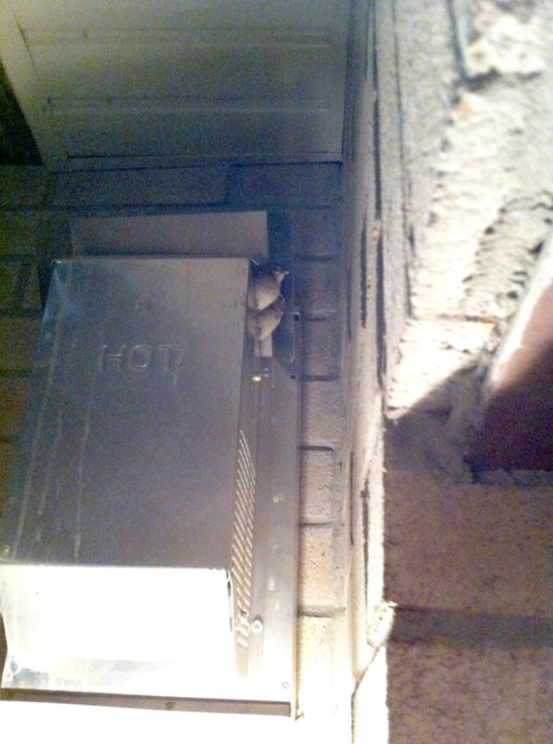 Agosto de 2014. La primera vez que los vi me pillaron con la guardia baja, pero no pensé nada malo. Me imaginé que querían calor. Se asustaban fácilmente y salían volando cada vez que usaba la puerta trasera, lo que me daba buenos sustos. Al principio los ignoré, pero empezaron a defecar y a construir su nido dentro del conducto.