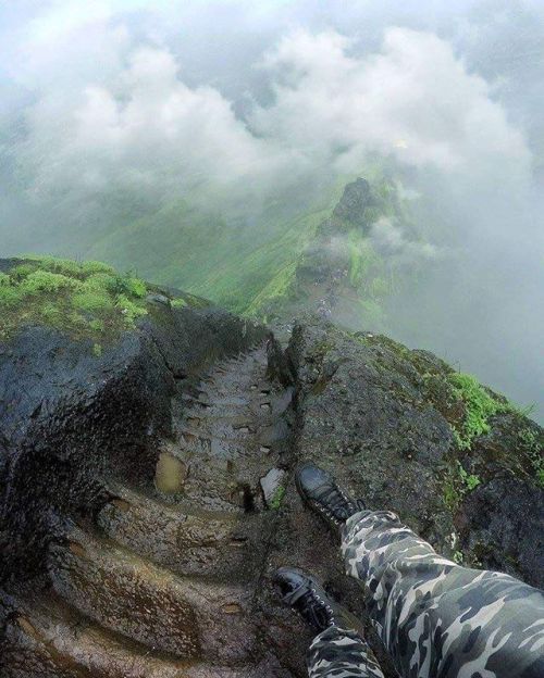 Escaleras extremas localizadas en Harihar fort / Harshagad, la cual es una fortaleza ubicada a 48 km de Igatpuri, distrito de Nashik, de Maharashtra. India.