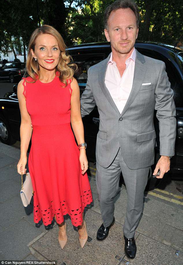 Lady in red: The singer, 45, dazzled in a vibrant red dress as she joined her handsome husband, Red Bull Formula One boss Christian Horner, 44, at the charity event