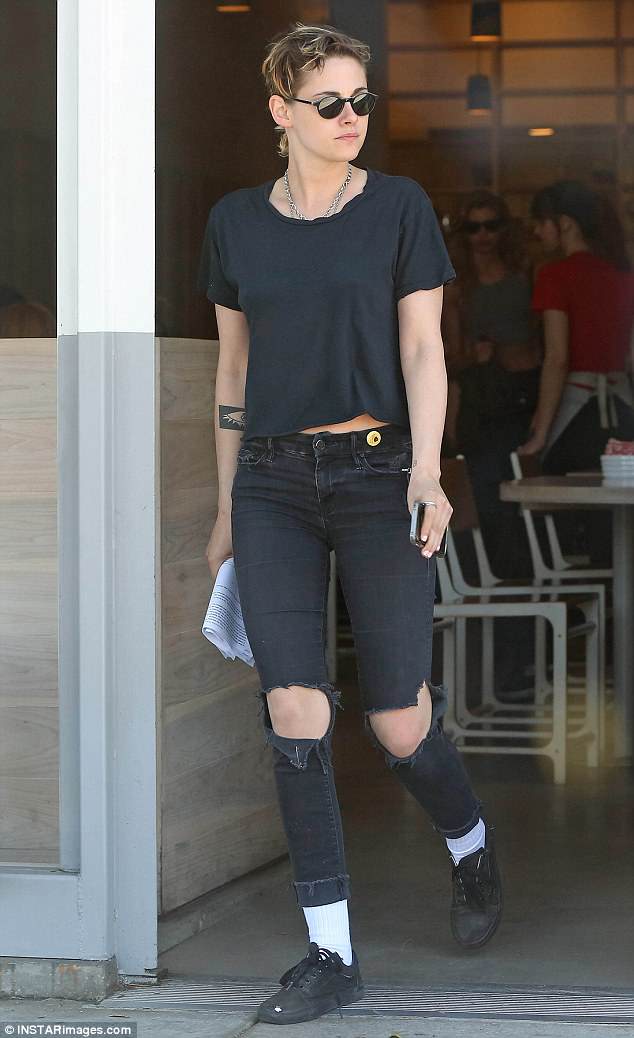 Both in skinny jeans, Kristen wore her favorite ripped pair with a cropped black T-shirt, white socks and practical black pumps, while model Stella teamed hers with a grey T-shirt.