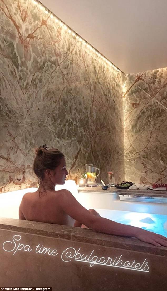 It was a busy day on Friday as next up Millie headed back to her hotel spa for a skin scrub before sharing a snap of herself relaxing in the spa’s private suite.