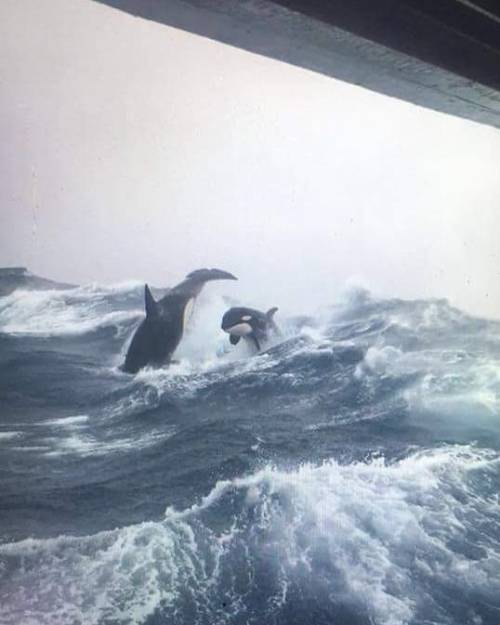 Orcas rompiendo en mares agitados, foto tomada desde un barco de pesca cerca de la costa de Nueva Escocia.