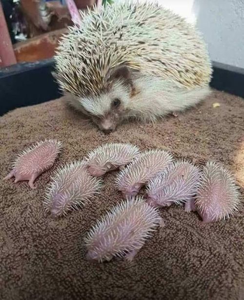 Una madre erizo con sus crías. Al momento de nacer, las púas/agujas son tan frágiles y blandas, que no daňan a la madre al momento del parto.